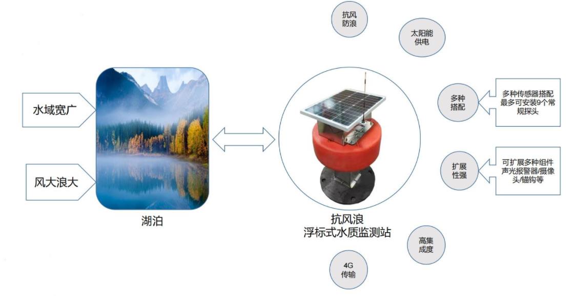 江河、湖泊、水庫等,是水的主要源頭,也是污染物的主要入口,水質(zhì)監(jiān)測尤為重要。但此類場景復(fù)雜多變,水質(zhì)狀況難以把控,污染程度存在區(qū)域性變化,且系統(tǒng)安裝環(huán)境更為復(fù)雜惡劣。需要多種類型的系統(tǒng)根據(jù)環(huán)境情況進(jìn)行布點(diǎn)搭建。
